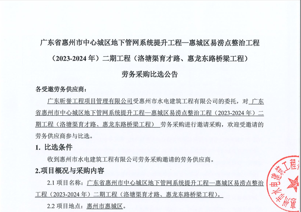 廣東省惠州市中心城區(qū)地下管網(wǎng)系統(tǒng)提升工程-內(nèi)街小巷排水管網(wǎng)病害修復及錯混接改造項目一期施工勞務采購比選公告……